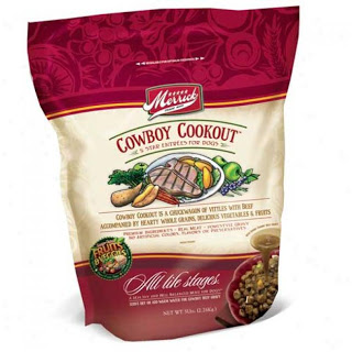 1. Just a little under a quarter cup of Merrick dried food. The flavor of the month is Cowboy Cookout.