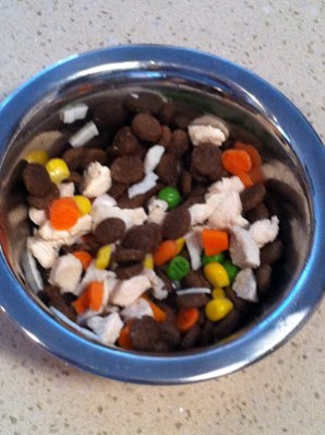 Mummy prepares my dinner with love! She actually cooks a different protein (usually rotating between chicken breast meat and beef), tons of vegetables (carrots, corn and peas) and a stock to add a little taste. Occasionally I get a special ingredient depending on what she finds in the refrigerator that is dog-friendly. She then mixes them with my favorite dry food – Taste of the wild.