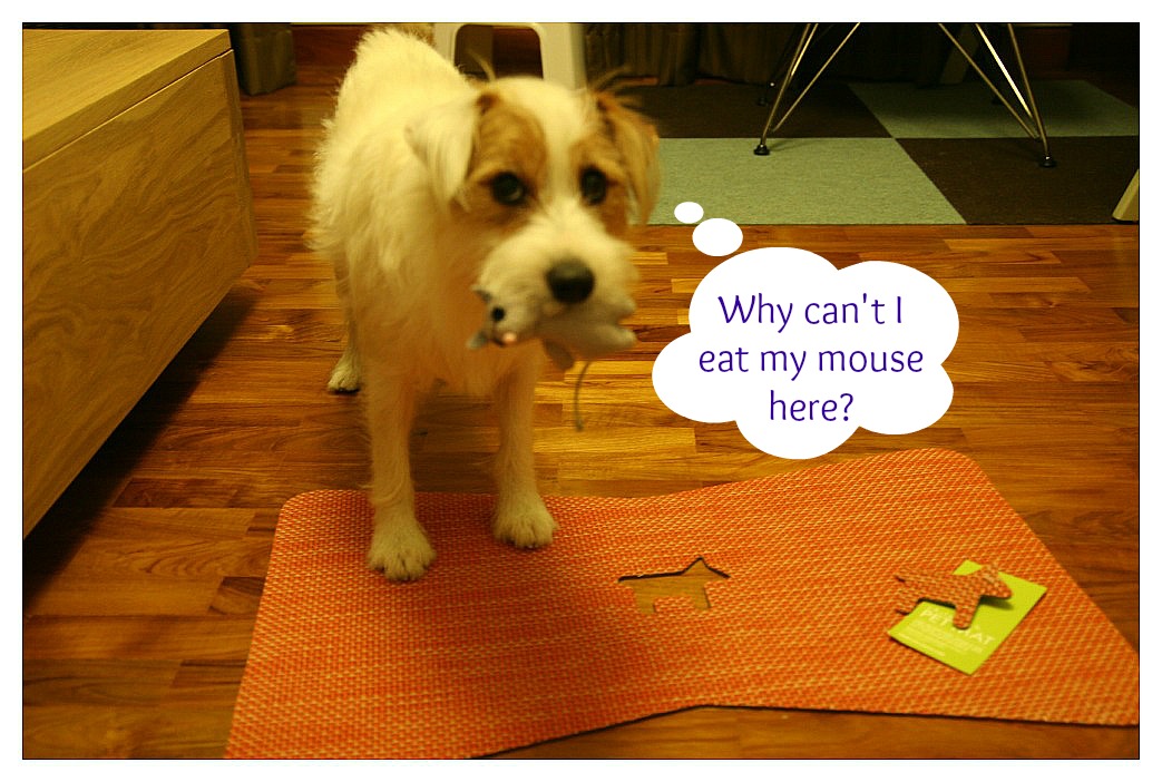 Note from Mummy: Unfortunately, these items aren’t available in Singapore and I had get them online. (much to the dismay of the Mister, but again, no one really cares about what he thinks. =P) As the website didn’t mention much on international shipping, I dropped them an email to enquire about shipping to Singapore. Doug from Petswag was really awesome and actually went the distance to give me a quote and liase with me directly to get the transaction settled in less than half an hour (from the first reply)! Kudos for the high efficiency!! And within a week, the items are in (and there’s a fat lazy crazy dog lying on on the bed and a dead looking mouse on the mat *shrugs*).
