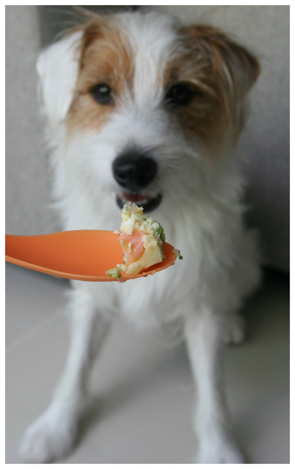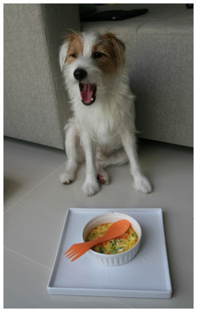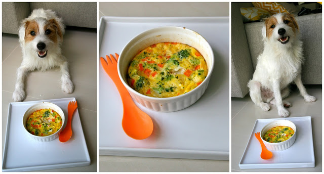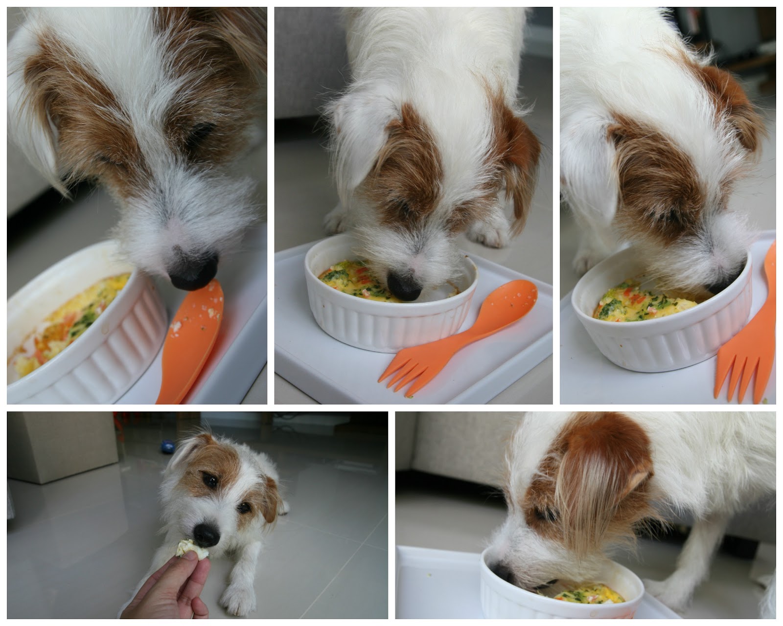 Mummy’s Note: This omelette is unbelievably easy to make and it tasted rather good! With a little pepper and salt seasoning, this would be perfect for even my own breakfast. The only downside was that while the omelette looked great, it was a tad bit overcooked and became a little rubbery. Lucky for me, the dog didn’t give a damn and ate it like it’s the best meal on earth. (THAT IS EXACTLY WHY I RATHER COOK FOR SAM THAN FOR THE MISTER!)