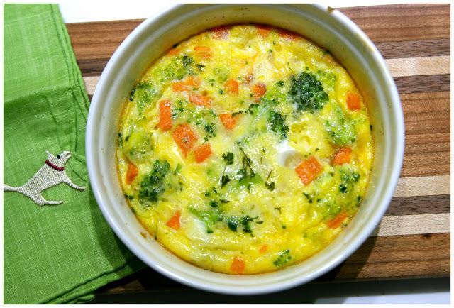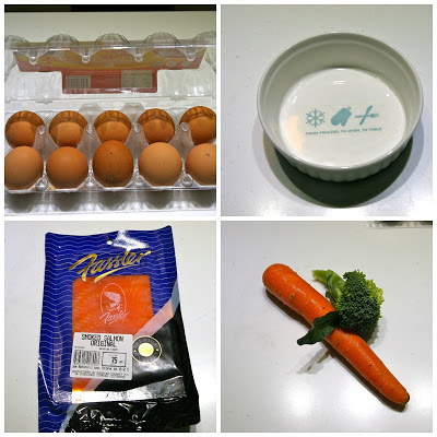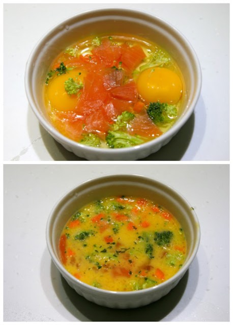 This is yet another hassle free recipe that is really easy to make. Simply crack the eggs directly into a lightly greased (Mummy used olive oil) ramekin, before adding all the other ingredients and then mix everything together.