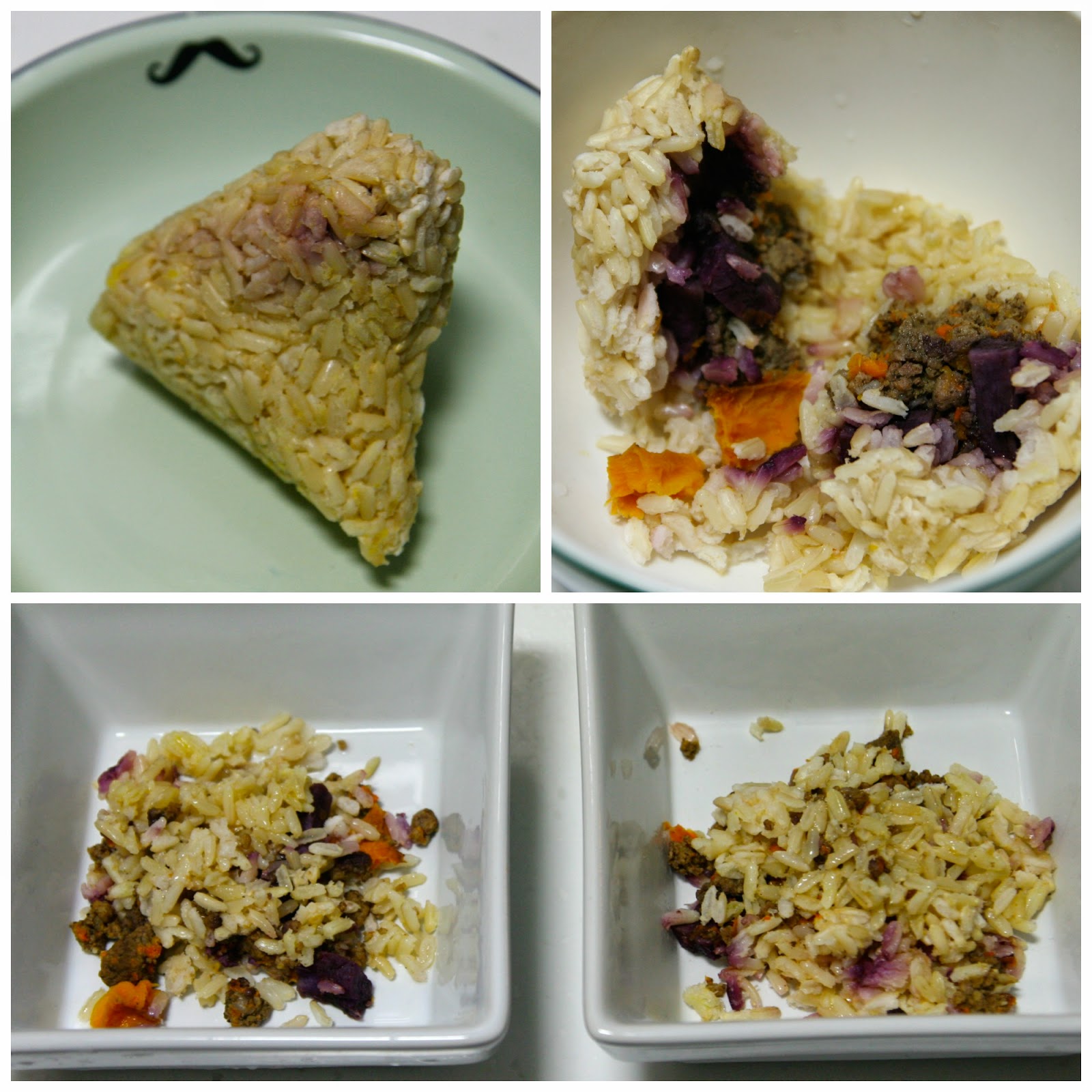 Instead of using glutinous rice, brown rice was used and rolled oats was added to keep the rice together. The meat filling was mutton.