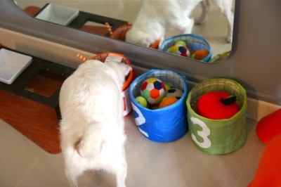 Basket THREE is for Pecan’s stinky stuffies (mine are all torn apart, so the intact ones are her)