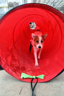 And within seconds of Daddy tossing a large piece of treat inside the tunnel…. in she went, ate it..and out she came.