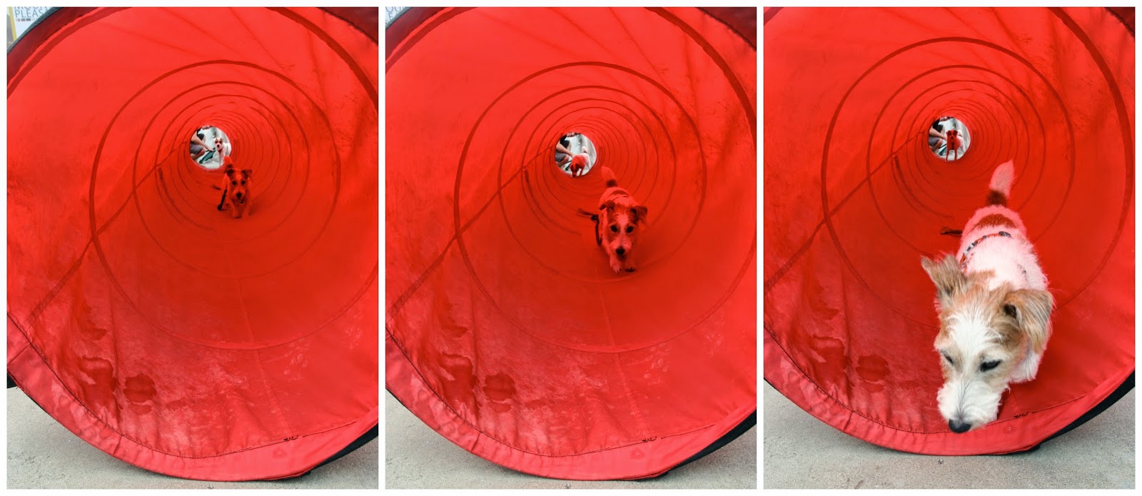 And within seconds of Daddy tossing a large piece of treat inside the tunnel…. in she went, ate it..and out she came.