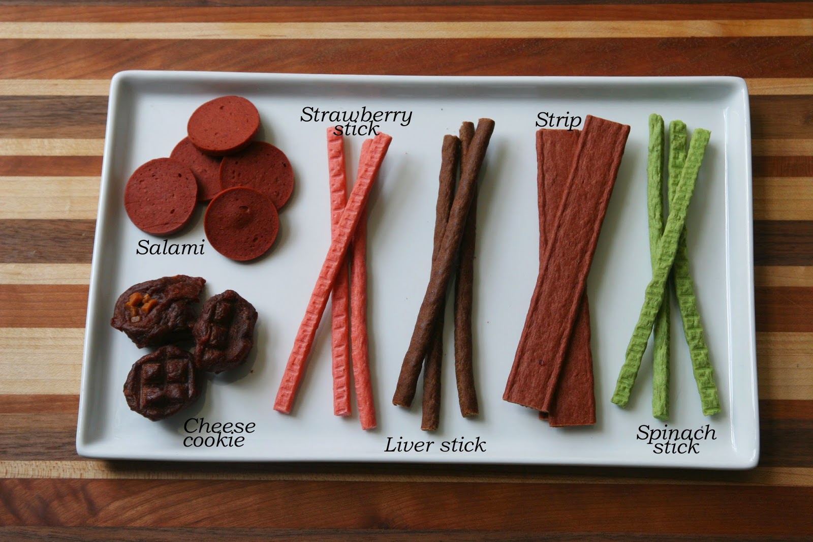 Although real chicken meat is the main ingredient in all of them, each treat is paired with a different ingredient (such as spinach, strawberry, cheese or chicken liver) to create a variety of flavours.