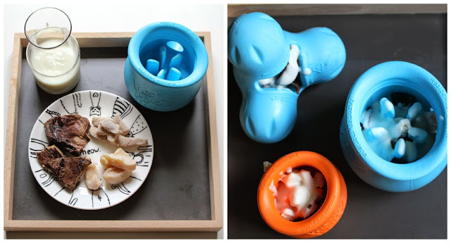Simply stick in some enticing treats (chicken and pork meat do wonders), pour some yoghurt over it and stick them into the freezer.