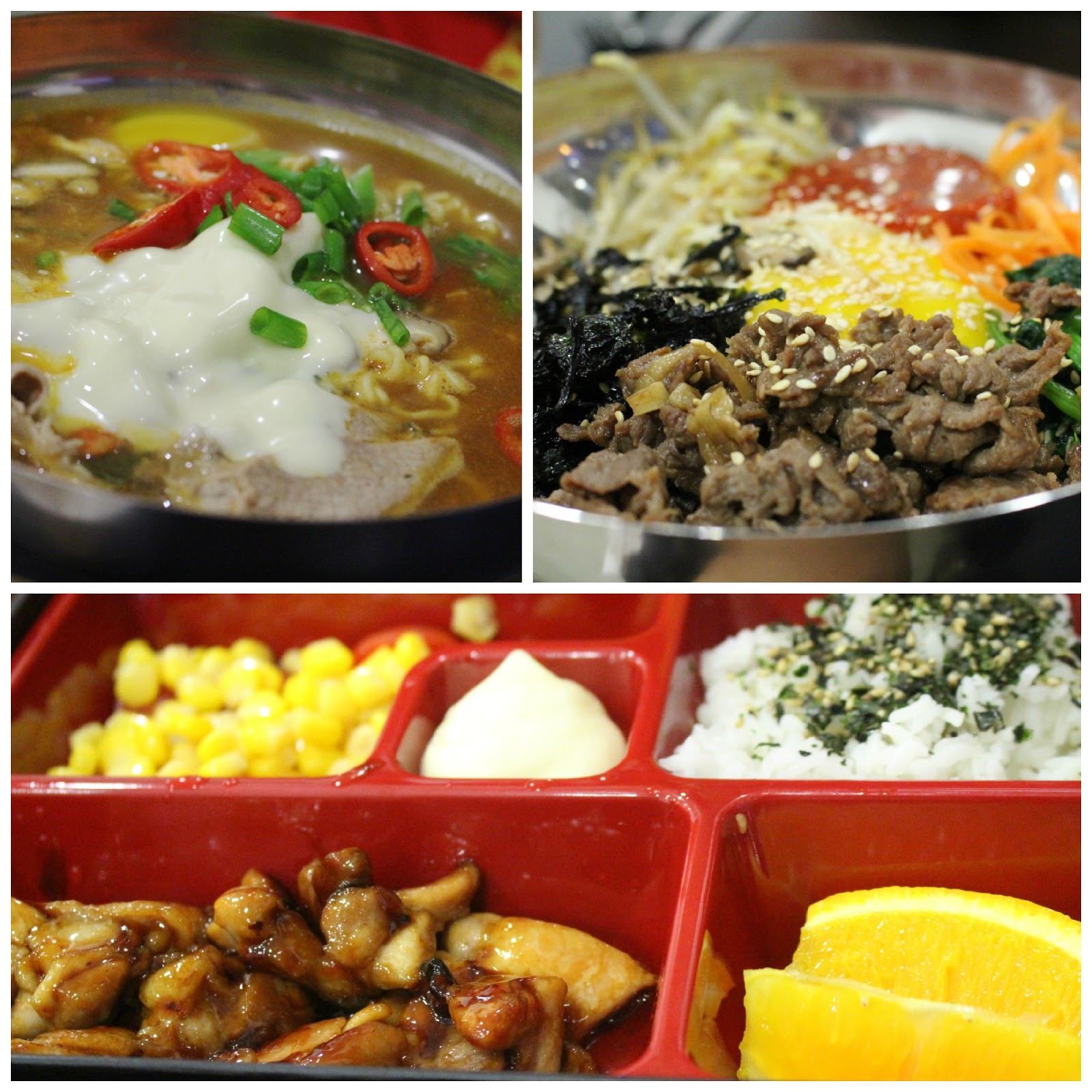 (Soupy Ramyun with Cheese, Beef Bibimbap and Terriyaki Chicken Bento)