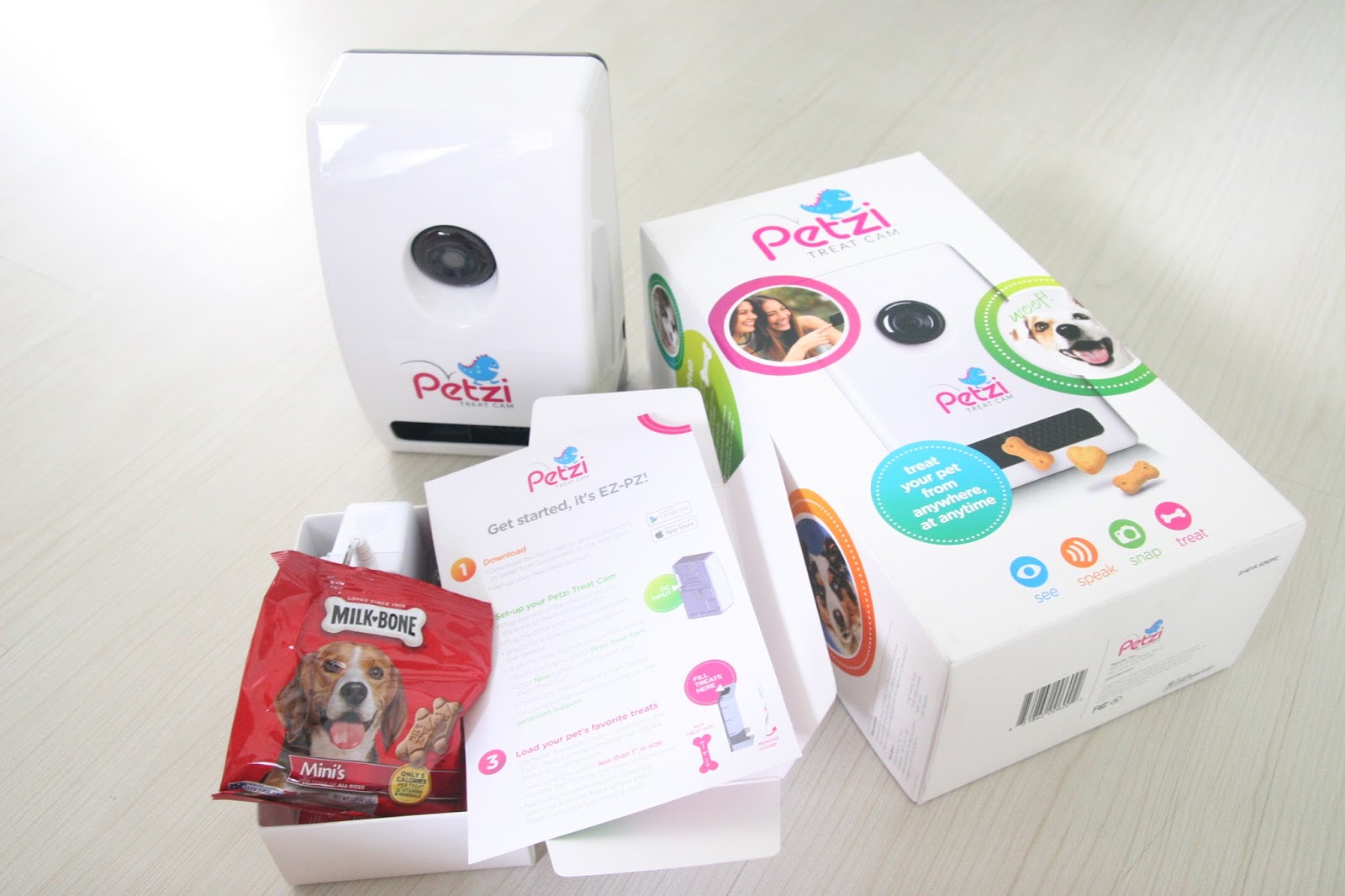 Besides the Petzi camera, an extra simple instruction sheet (a bit too simple to be honest) and two packets of Milk-Bone treats for starters are also included!