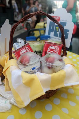 An alfresco style brekkie with food served in picnic baskets.