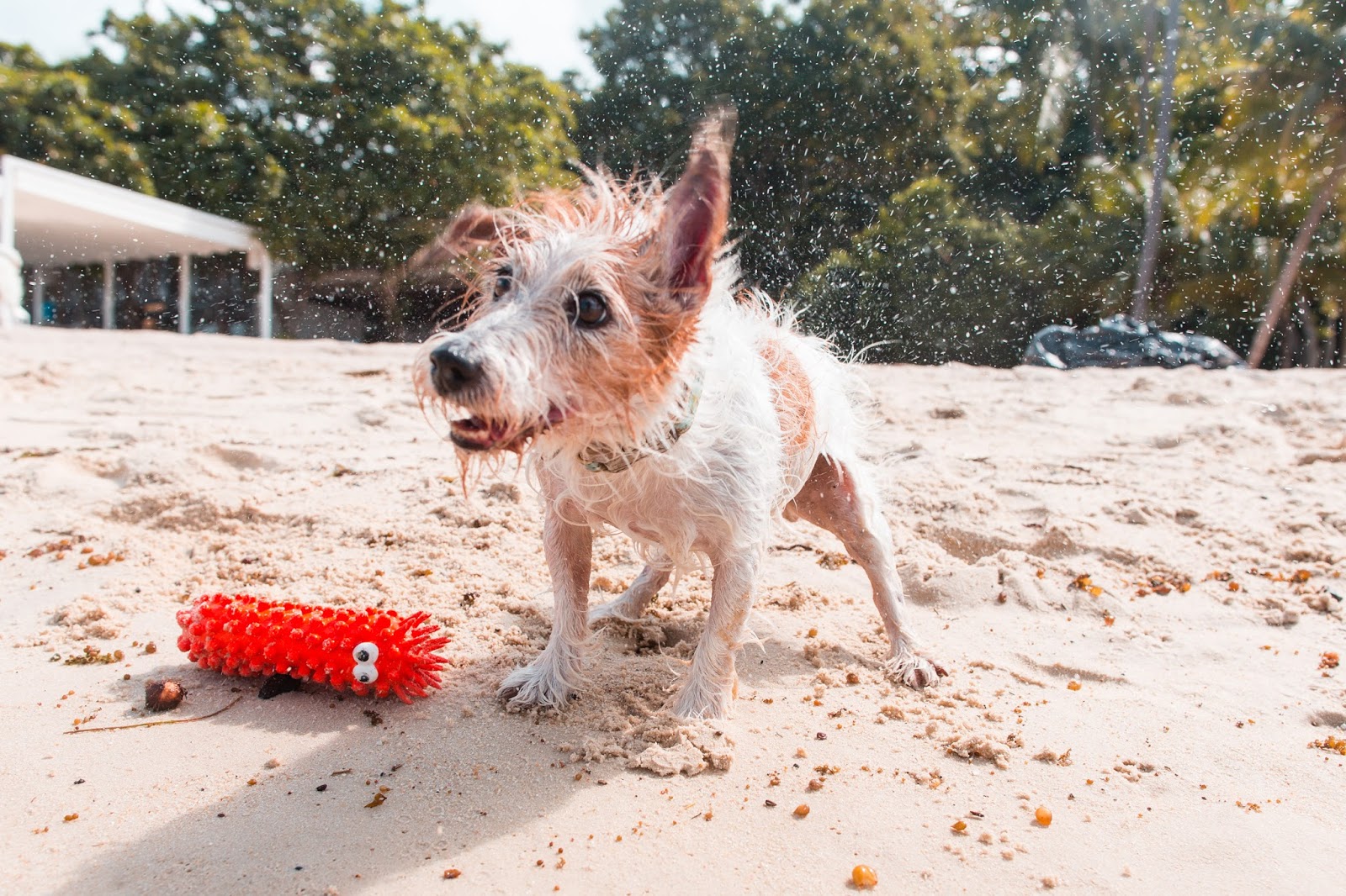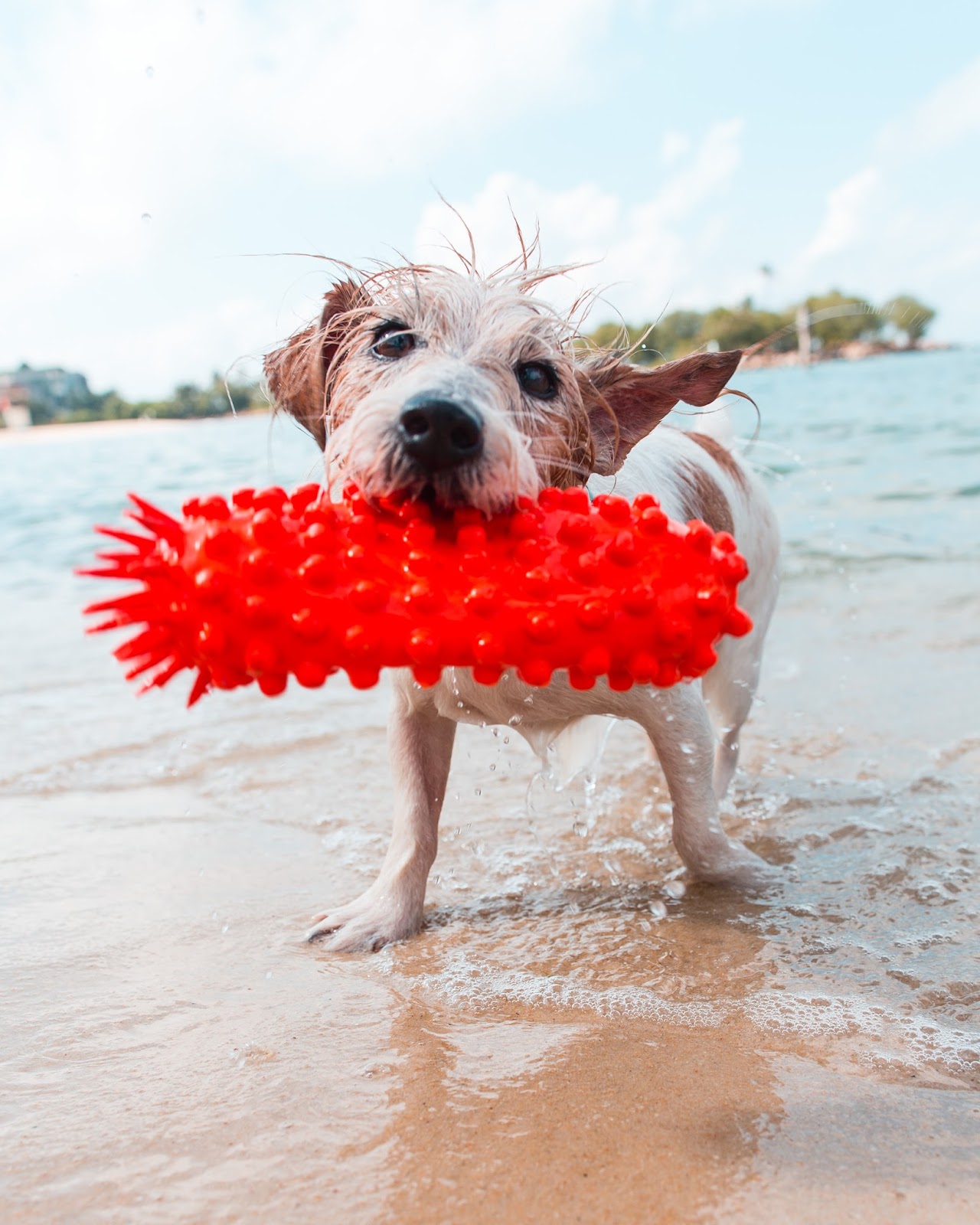 Of course Pecan’s favourite water toy, Mr Spikey, tagged along for the shoot!