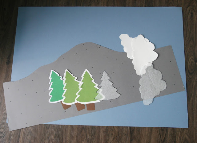Mummy’s tip: Use Blue-tac to secure the items to the background. This will allow you to shift the trees and clouds around as you deem fit. Plus, you can reuse the background for the next project.